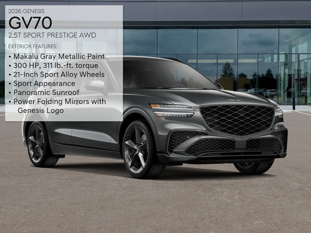 Not all rebates can be combined. Not all consumers will qualify for rebates. Please see dealer for details and eligibility. Final price is determined and set in agreement with consumer. Gray 2026 Genesis GV70 2.5T Sport Prestige AWD 8-Speed Automatic with SHIFTRONIC 2.5L DOHC
